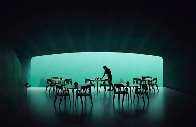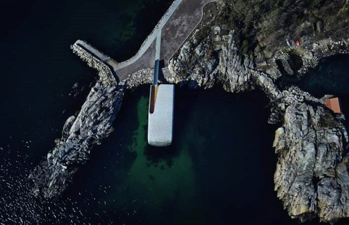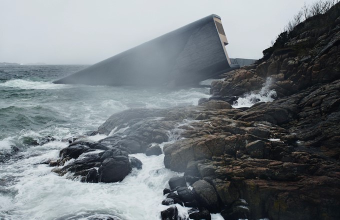 Located at the southernmost point of the Norwegian coastline, where the sea storms from the north and south meet, the restaurant is situated at a unique confluence. Marine species flourish here in the both briny and brackish waters to produce a natural abundance in biodiversity at the site. The Snøhetta-designed restaurant also functions as a research center for marine life, providing a tribute to the wild fauna of the sea and to the rocky coastline of Norway’s southern tip.